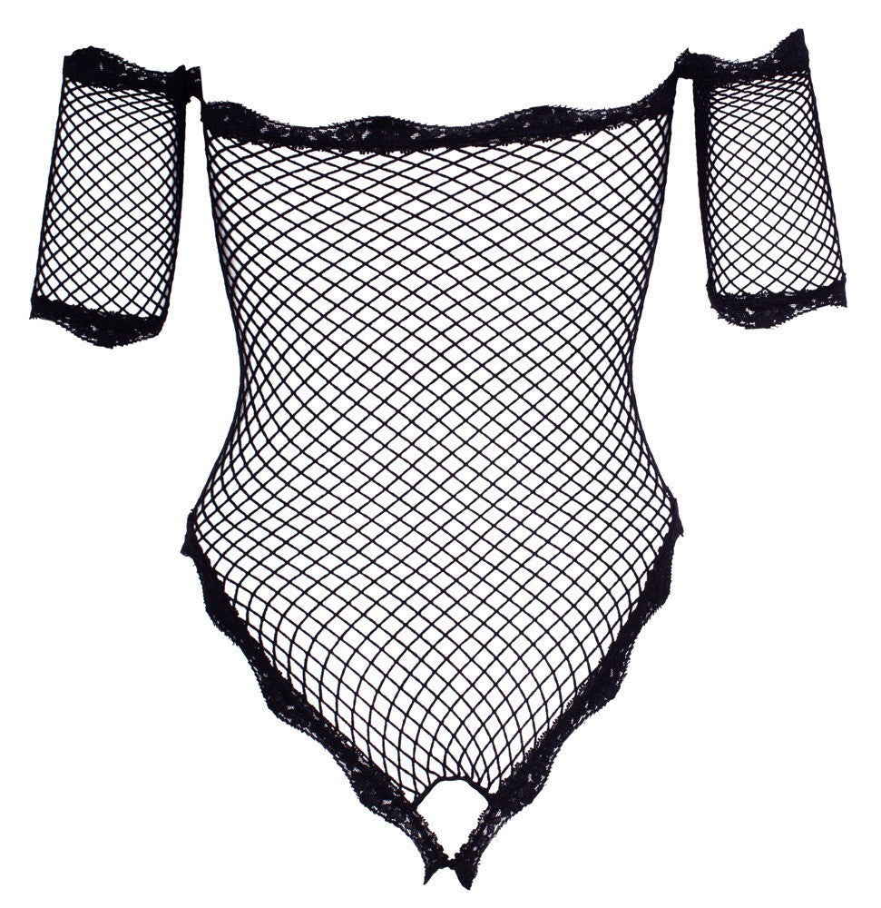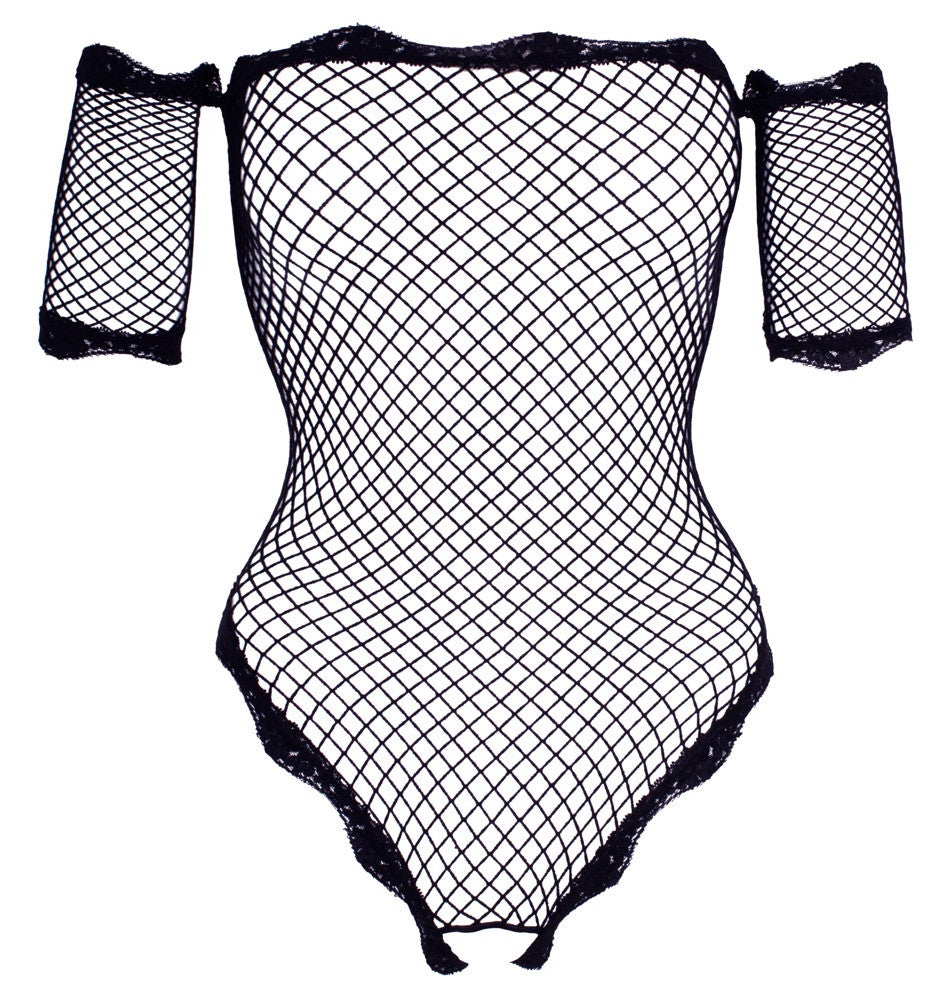 Body trasparente senza cavallo realizzato in morbida rete elastica con braccio corto cucito. Con scollo a spalla senza spalline ed eleganti finiture in pizzo sulla scollatura, sulle braccia e sulle gambe.