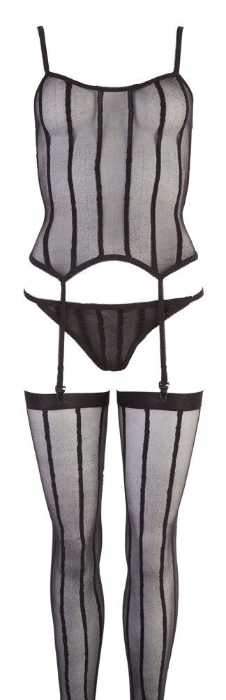Set erotico Guepiere Catsuit nero velato composto da top con reggicalze, perizoma e calze. Con righe verticali nere.Realizzato in Poliammide in taglia unica dalla S alla L