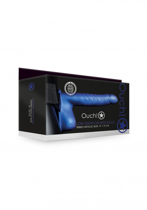 Fallo cavo indossabile Ribbed Hollow Strap-on with Balls - 8'' / 21 cm - Met Blue