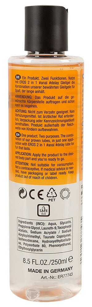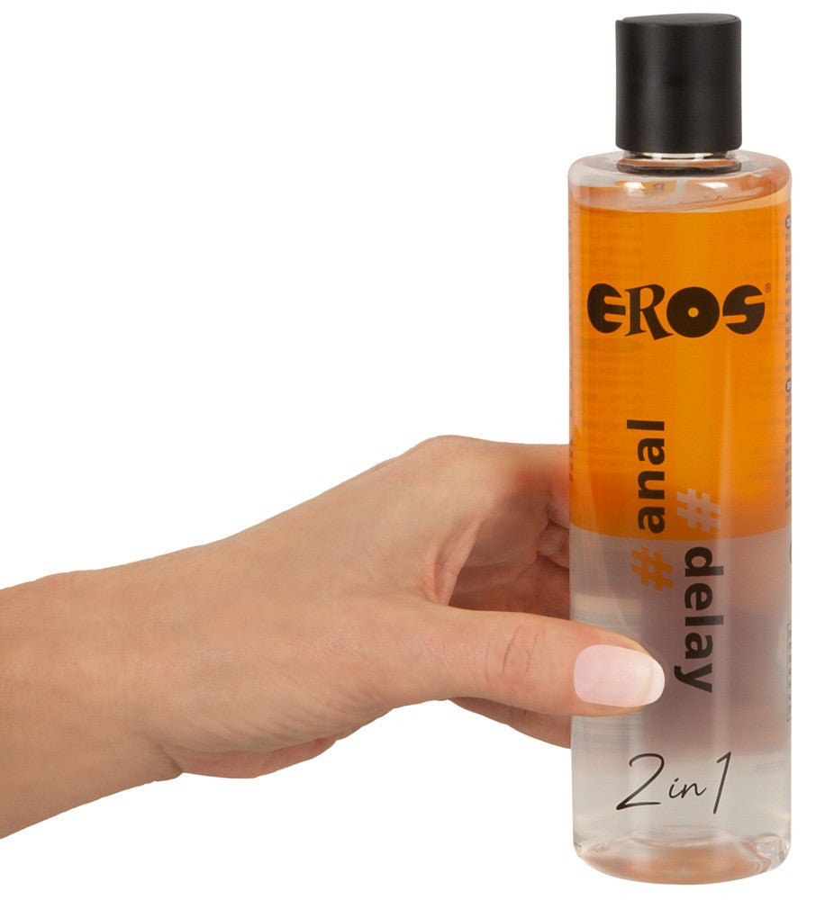 Il lubrificante a base d'acqua 2in1 anal & delay di EROS con Laureth-9 garantisce una perfetta scorrevolezza e una lubrificazione di lunga durata senza perdita di sensibilità. Sicuro per i preservativi in lattice. Inodore e insapore.