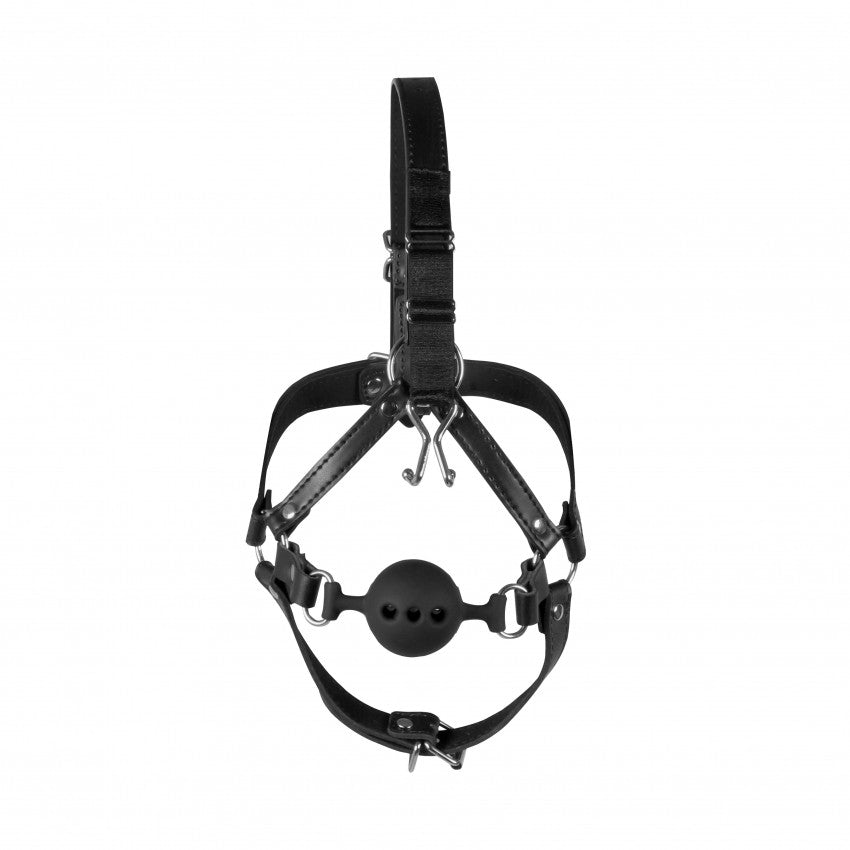 Imbracatura viso con morso Head Harness with Breathable Ball Gag and Nose Hooks Black
