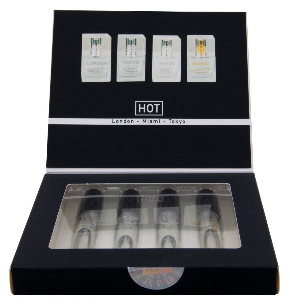 Il Pheromone Perfume Tester Box LMTD men di HOT presenta 4 fragranze urbane selezionate in un set che vi immerge nello spirito delle città di Londra, Miami, Tokyo e Dubai. Ciascuna delle fragranze è arricchita con feromoni per sottolineare e accentuare l'attrattiva maschile. Per un'aura irresistibilmente attraente!