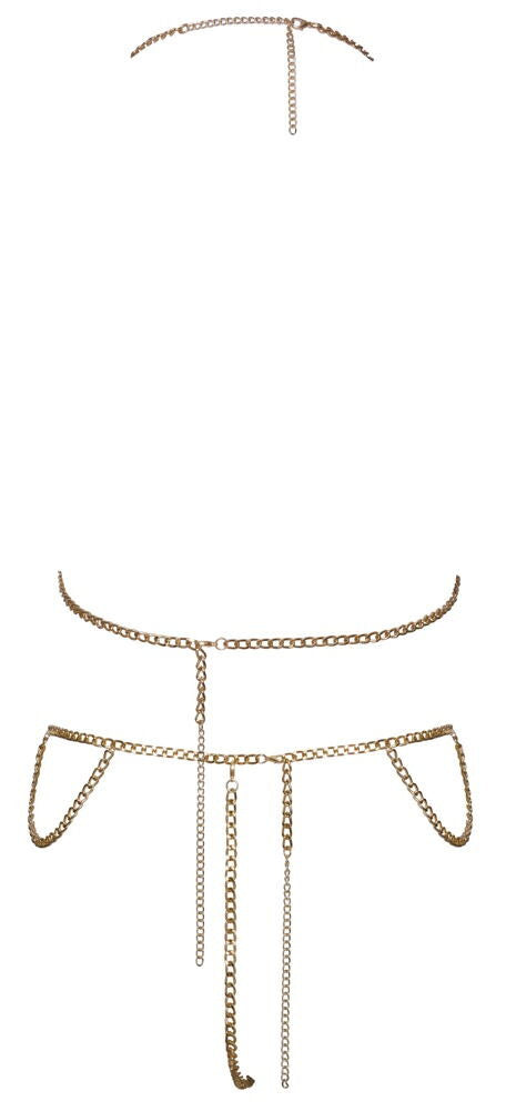 Look glamour con un tocco speciale! Bikini a catena color oro di Cottelli ACCESSOIRES con top a collo alto e stringhe. Lussuose catene sul davanti su seno, zona pubica e fianchi. Catena stimolante all'inguine fino a sopra il sedere. La catena al collo, la catena posteriore e la catena di stringhe possono essere regolate e personalizzate individualmente con chiusure a moschettone. Indossato da solo come lingerie per un look erotico o abbinato con stile a costumi da bagno e abiti aderenti, il bikini a catena glamour è sempre un eccitante richiamo per gli occhi!