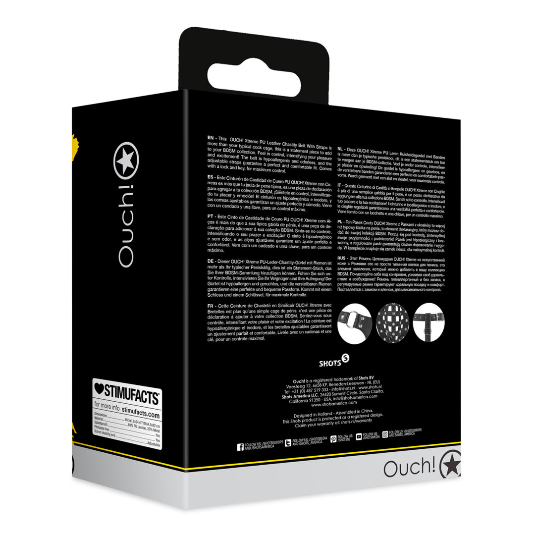 Questa cintura di castità OUCH! Xtreme PU Leather Chastity Belt With Straps è molto più della tipica gabbia per il pene, è un pezzo forte da aggiungere alla vostra collezione BDSM. Sentitevi in controllo, intensificando il vostro piacere e la vostra eccitazione! La cintura è ipoallergenica e inodore e le cinghie regolabili garantiscono una vestibilità perfetta e confortevole. Viene fornita con un lucchetto e una chiave, per il massimo controllo.