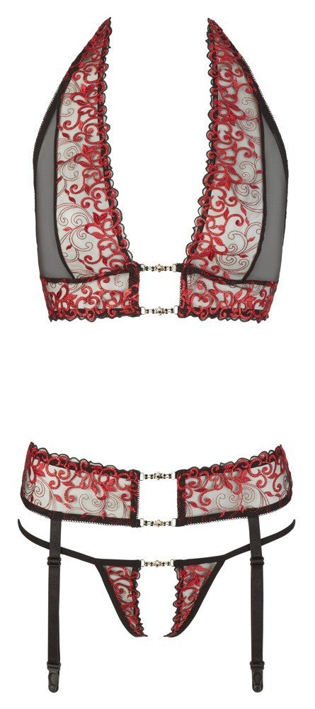 Set di bretelle in 3 pezzi con bretelle allacciate con chiusura a clip, cintura per bretelle con chiusura a gancetto sul retro e bretelle regolabili, nonché una corda completamente senza cavallo. Realizzato in Powernet nero. Impreziosito da ricami glitter rossi dalla scollatura al cavallo. Con una parte anteriore continuamente aperta, collegata da 5 elementi di strass.